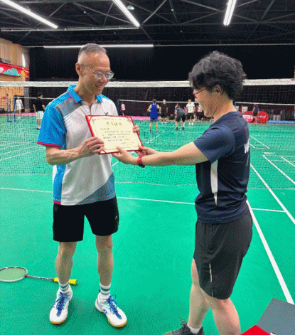 最终,“惊雷队”凭借稳定发挥问鼎冠军,“暴雨队”、“狂风队”与“闪电队”分列二至四名。在热烈的颁奖仪式上,“惊雷队”队长刘永在阵阵掌声与欢呼声中高举“寰羽杯”,将全场氛围推向高潮。本次颁奖还特别设置了一个温馨而庄重的环节,为退休职工龚晏邦老师颁发了“特殊贡献奖”,以感谢其长期以来对羽协活动的积极参与与大力支持,彰显了羽毛球运动在研究所中薪火相传、历久弥新的精神内涵。