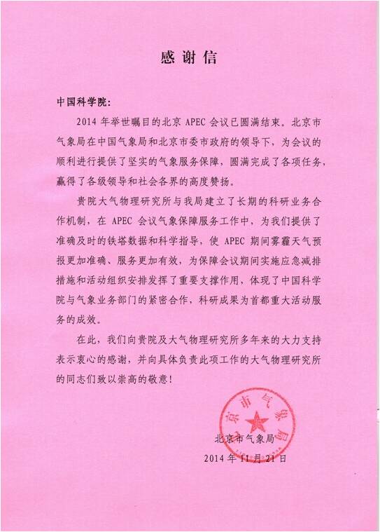 2014年11月7-12日,APEC会议在北京隆重召开,北京市气象局在中国气象局和北京市委市政府的领导下,承担着会议期间的气象保障工作。在这期间,大气所为北京市气象局提供了准确及时的铁塔观测数据(325米铁塔和香河铁塔)和科学指导,使APEC期间雾霾天气预报更加准确,为会议期间实施应急减排措施等发挥了重要支撑作用,使得北京气象局圆满完成了会议期间的气象保障任务。北京市气象局近日发信给中国科学院表示感谢,感谢大气所及其科研人员的大力支持!
