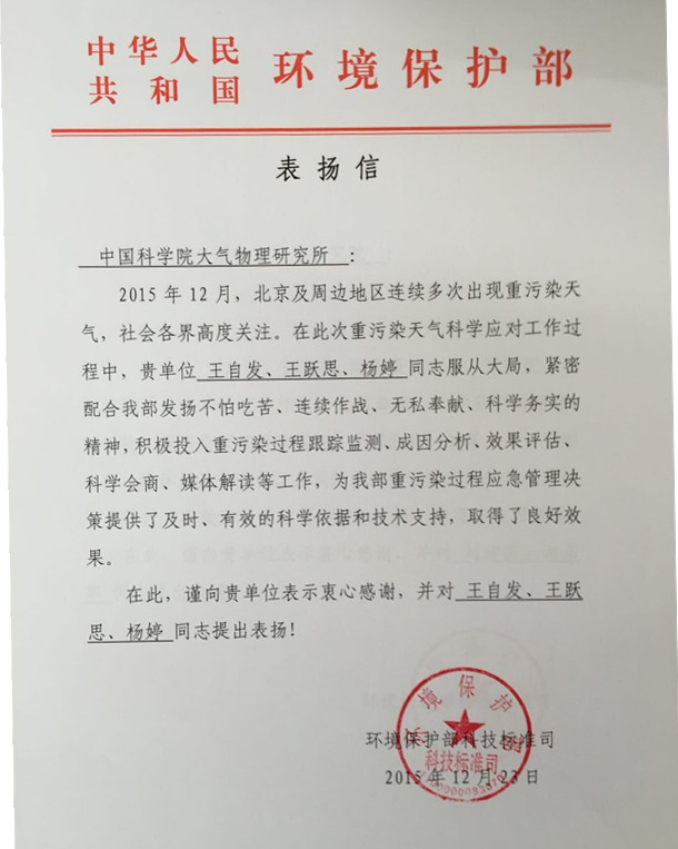12月23日,中国环境保护部科技标准司给我所发来表扬信,感谢大气所在环保部应对12月以来北京及周边地区连续多次出现的重污染天气的管理决策中提供的科学支持,对我所王自发、王跃思、杨婷三位科研人员发挥的重要作用表示感谢。期间,我所同志配合环保部发扬不怕吃苦、连续作战、无私奉献、科学务实的精神,积极投入重污染过程跟踪监测、成因分析、效果评估、科学会商、媒体解读等工作,为环保部重污染过程应急管理决策提供了及时、有效的科学依据和技术支持,取得了良好的效果。(所办供稿)