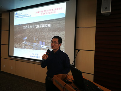 特邀北京旗云创科科技有限责任公司董事长王永博士做“光热发电与气象环境监测”报告。王永以自己渊博的学识、详实的科学数据,汇报了开展光热资源监测中设备精度、设备的稳定方案以及解决方案等领域的工作。