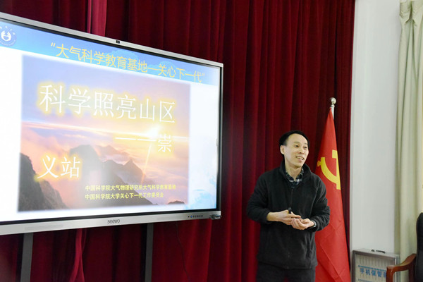 大气所正高级工程师王立志介绍了“大气科学教育基地”—关心下一代阳光工程“科学照亮山区”项目目的,并从公益主旨、项目意义、实施方案、运行保障等方面进行了详细汇报。