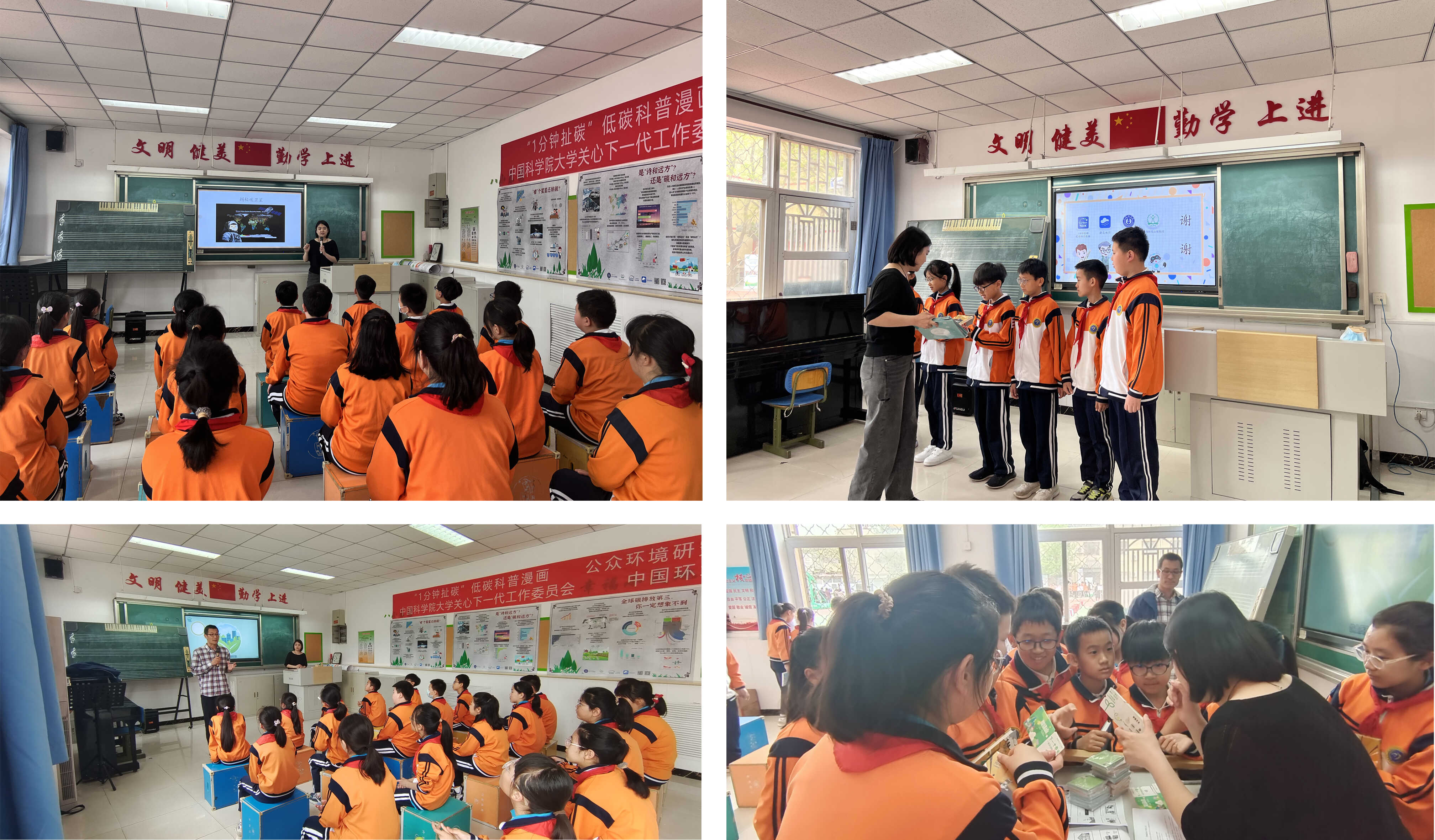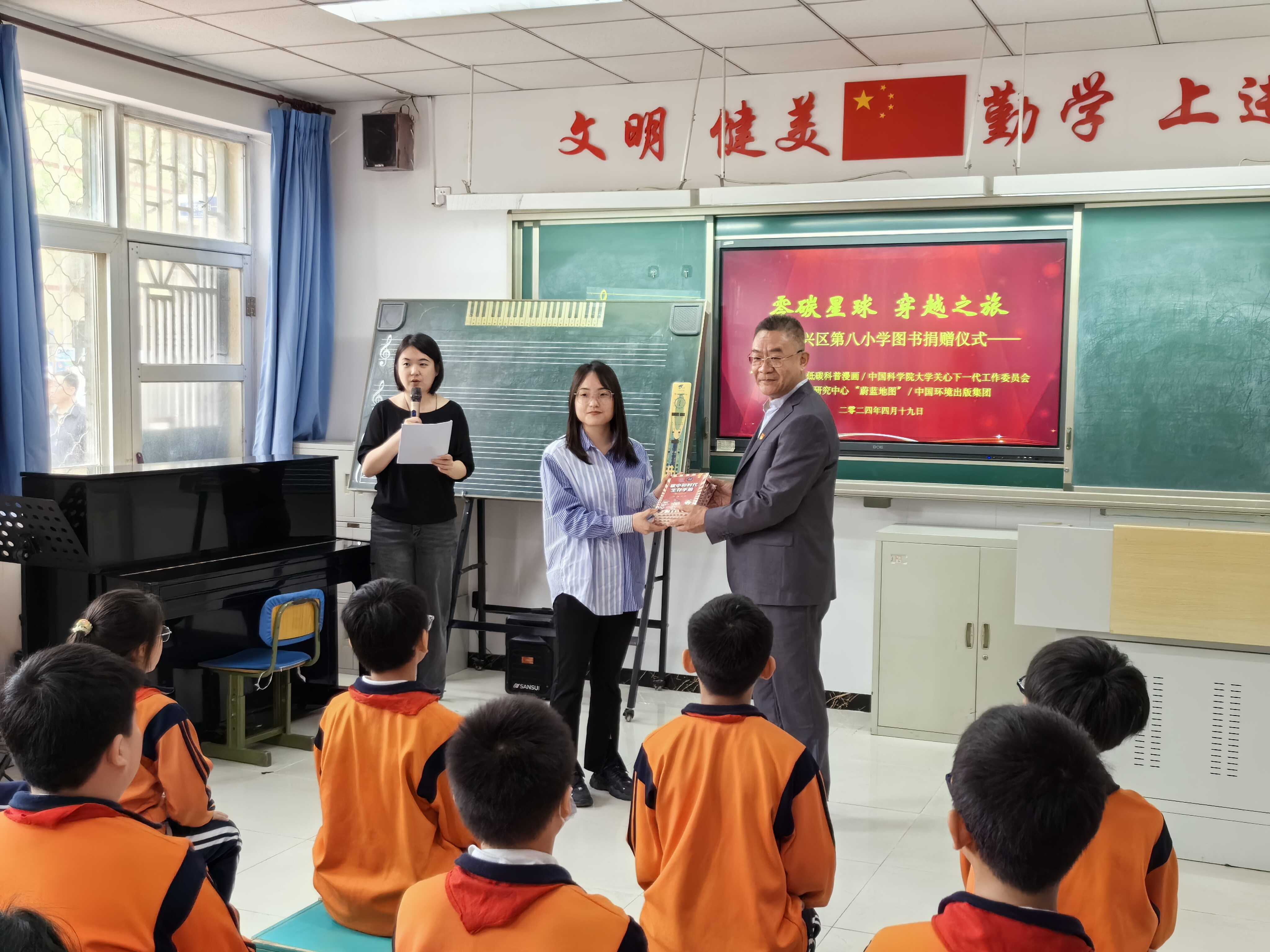 首先是赠书活动,生态环境部环境规划院碳达峰碳中和研究中心主任蔡博峰研究员、中国科学院大学关心下一代工作委员会副秘书长刘荣华老师、中国环境出版集团科普专员梅霞老师分别向北京市大兴区第八小学捐赠《碳市场来了》、《碳中和时代生存手册》、《左手南极 右手北极》等科普图书,希望八小的同学们能通过阅读碳中和相关科普书籍,开阔视野、拓展思路、增长知识。