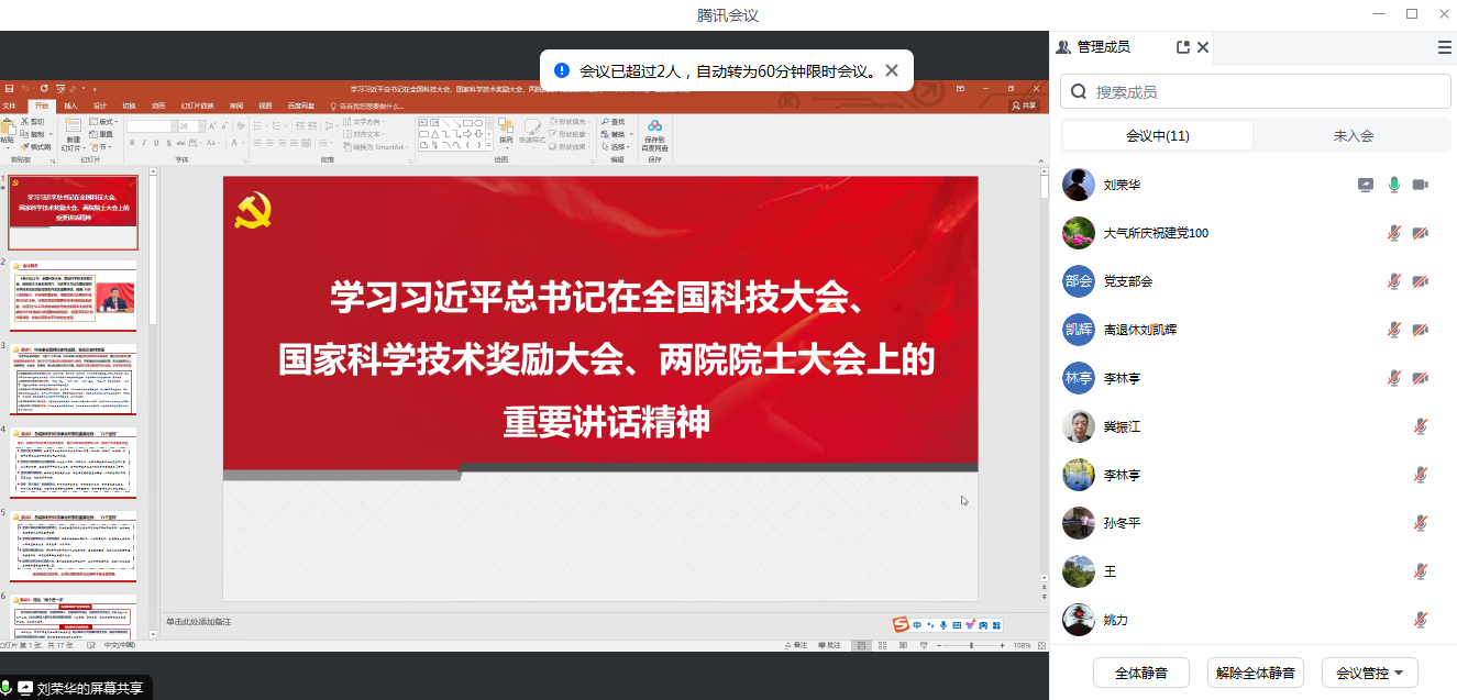 首先,离退休党总支书记刘荣华带领大家学习习近平总书记在全国科技大会、国家科学技术奖励大会、两院院士大会上的讲话。通过学习,深刻认识建设科技强国的极端重要性、紧迫性和艰巨性,进一步明确了中国科学院当前和今后一个时期的努力方向。同时要求各支部认真学习习近平总书记在全国科技大会、国家科学技术奖励大会、两院院士大会上的讲话。