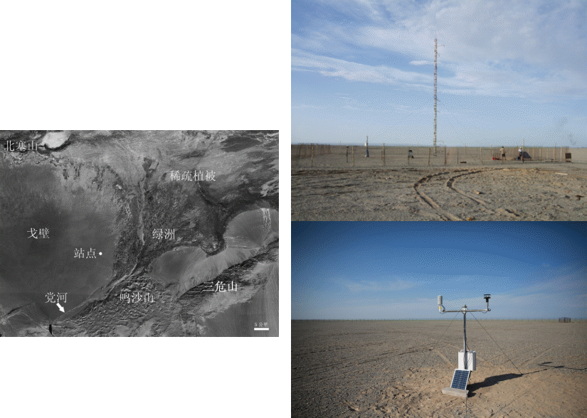 敦煌戈壁观测站(40°9.49′N,94°30.98′E,海拔1148 m,以下简称敦煌站),位于甘肃省河西走廊敦煌市西部的戈壁滩。观测站下垫面为无人居住的沙石戈壁荒漠区,主要由沙、砾石、砾砂和中粗沙组成,是党河冲洪积扇中下部区域,地势平坦。