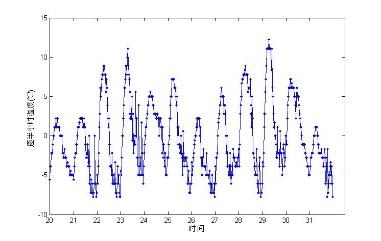 图1 北京首都机场2014年12月20-31日逐半小时地面气温,每一天的标度处为零点。可以看见气温在一天之内由低到高再变低的过程,也即气温的日循环
