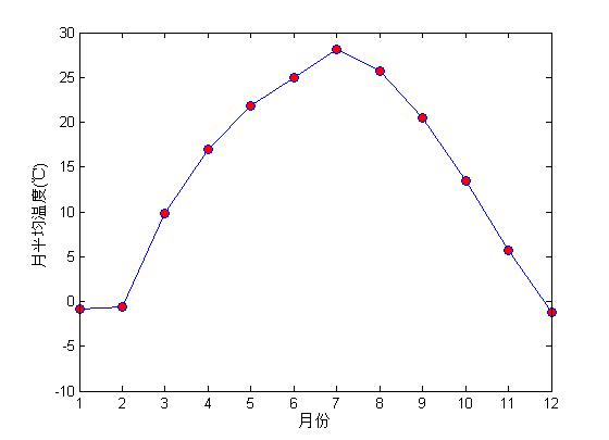 图3 北京首都机场2014年逐月地面平均气温,没有了月时间尺度以下的信息,但气温在年内的变化看得很清楚,有明显的季节变化