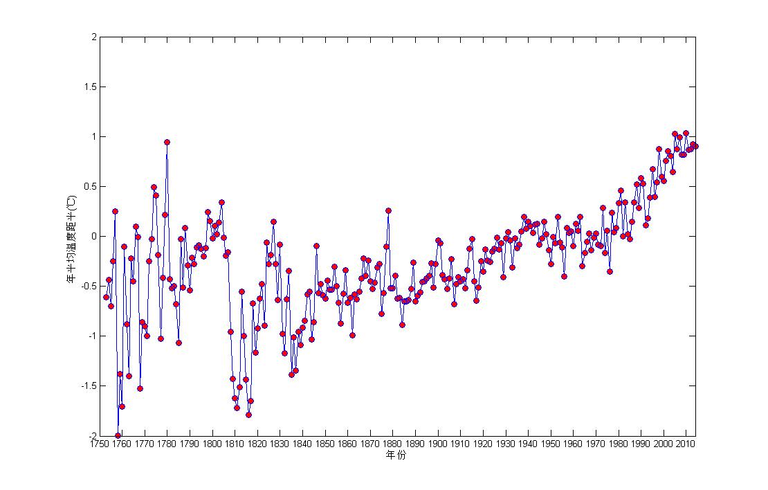 图4 全球陆地表面年平均气温距平序列(相对于1951年-1980年的平均值),可以明显看出上世纪五六十年代以来的全球变暖趋势