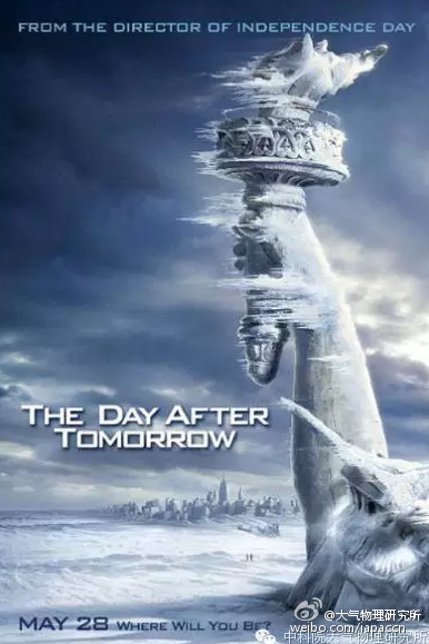 2004年一部灾难电影《后天》让人们见识到了大自然狂暴可怖的一面,世界各地经历了冰雹、龙卷、海啸、暴风雪的洗礼之后气温骤降,陷入了冰河时代一般极度的严寒,人类文明岌岌可危。影片中古气候学家霍尔对此的解释是:全球变暖造成冰盖融化稀释了海水,中断了北大西洋的热盐环流,从而导致气候剧变。