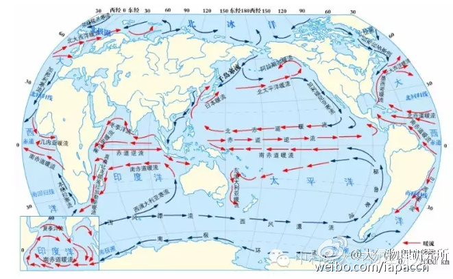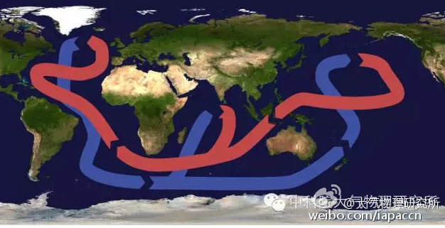 早在1987年,美国地球年代学和海洋化学家Broecker就提出了全球大洋输送带的概念。如图所示,红色线条表示表层洋流,蓝色线条表示深层洋流。表层海水在北大西洋地区沉入深海后一路向南在南极地区绕极而流,随后分为两支分别在印度洋和北太平洋上翻到海表,再绕过非洲南部从大西洋北上,形成一个闭合的传送带。海水在流动过程中伴随着物质和能量的传输,对维持全球能量平衡有着重要作用。不过由于海洋观测资料无论在时间长度还是空间分布上都十分匮乏,这幅概念图中的许多环节尚未得到证实,还有待于进一步研究。