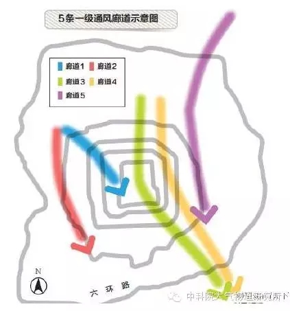 北京五条通风带主要为:(1)植物园到昆明湖到昆玉河到玉渊潭,这是要改善西北部通风环境;(2)植物园-西五环及两侧绿化带,这是为了改善西部通风环境;(3)从太平郊野公园到东小口森林公园到中南海再到京沪高速及两侧绿化带,这是为了改善中心城区沿中轴线地区通风环境;(4)从清河郊野公园到朝阳公园-东北五环的绿地再到京沪高速及两侧绿化带,这是要改善中心城区东部酒仙桥-CBD沿线地区通风环境;(5)从京密高速到东五环及两侧绿化带,改善中心城区东部地区通风环境。
