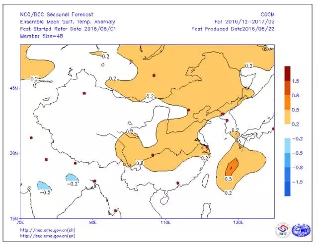国家气候中心用海气耦合模式提前半年做的2016年冬季温度异常预报