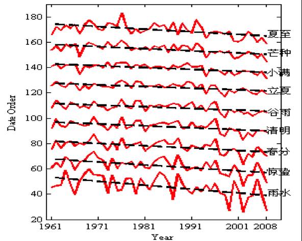 我所副研究员钱诚的研究揭示,因为整体的变暖,每年的前半年,即24节气的前12个节气(立春、雨水、惊蛰、春分、清明、谷雨、立夏、小满、芒种、夏至、小暑)所反应的物候整体提前,而下半年的节气(立秋、处暑、白露、秋分、寒露、霜降、立冬、小雪、大雪、冬至)则整体推迟。