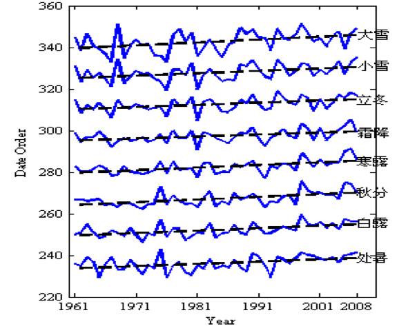 夏末到初冬阶段的气候节气显著推迟5-6天,Qian et al. (2012)