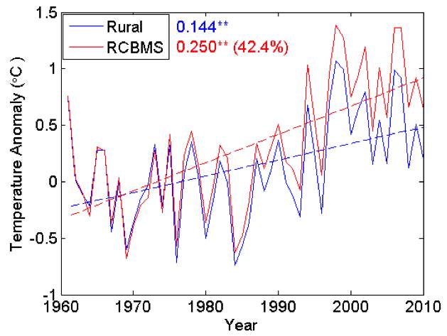 黄河中下游区域城市年平均温度(红色)和农村年平均温度异常在1960-2010年的变化,Qian et al. (2016)