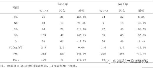 从图1、2和表1可知:2017年春节期间的环境空气质量比2016年春节期间的情况好了不少,无论是PM10、PM2.5的浓度还是气态污染的浓度。