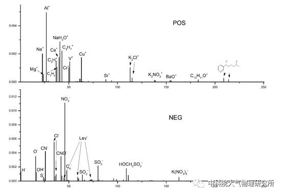 使用SPAMS 0525可以得到不同类型单个颗粒物的质谱信息,通过对这些质谱数据的分析和分类,我们可以得到烟花爆竹颗粒物的质谱特征。方法是从花爆竹影响相对集中的时间段(初一至初三)的平均质谱数据中剔除其它时间的质谱信息,以此为烟花爆竹的特征质谱。