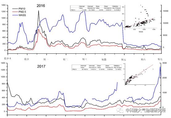 从上图也可以看出,这两个春节假期,颗粒物数量与质量的变化趋势是有很强的相关性的,2017年相关性(R2)达到了0.76,2016年则为0.47。