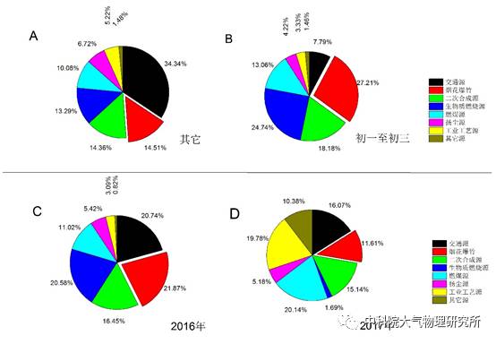 从图7可以看出:烟花爆竹的燃放对春节期间的PM2.5的贡献还是较为显著的,无论是没有控制的2016年(图C 21.87%)还是得到有效控制的2017年(图D 11.61%),烟花爆竹燃放对环境颗粒物数量上的影响都是十分关键的一个污染原因。