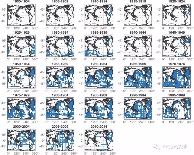 全球海洋氧含量观测数据分布(1990-2014),每隔5年做一个统计,蓝色的点是观测的位置