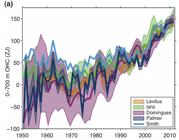 上世纪90年代起就有科学家发现一些区域海洋在变暖,直到2000年,美国科学家S. Levitus第一次正式给出了一个被广泛使用的海洋热含量时间序列,首次给出了海洋变暖的直接证据(热含量是反映海水整体温度变化情况的一个指标)。但海洋到底变暖速率有多快?2013年联合国发布的国际政府间气候变化评估报告第五次报告(IPCC-AR5)中的1950-2010年间海洋上层700米热含量变化估算(图2)显示,不同机构独立做出的估算差异很大:最小的估计是最大估计的仅一半!这说明海洋到底变暖了多少还有很大争议。