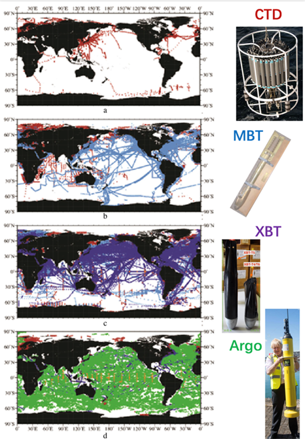 海洋变暖多少的争议来源于过去海洋观测数据质量和数量的不足。如图3,在上个世纪,海洋观测主要分布在人类活动较多的北半球或者主要国际航线上,很多海区都没有观测。直到本世纪,Argo观测网的构建,才使得海洋第一次有了接近全球海区的覆盖(图3)。一些海洋观测数据质量也存在问题,比如XBT数据和MBT数据 (图3)均存在系统性偏差。
