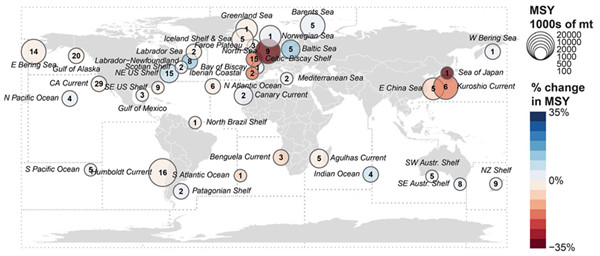 图5. 海洋渔业生产力的变化幅度:圈内数字代表净生产力变化大小。圈内颜色代表上升或者下降的百分比。图自(Free et al. 2019)。