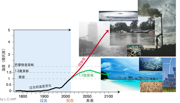 减少二氧化碳等温室气体排放是解决全球变暖的最终方法。所以,人类的未来掌握在自己手中!选择什么样的未来需要每一个个体、社会、政府等共同努力(图6)。2015年12月,各国政府在巴黎气候变化大会上通过《巴黎协定》,主要目标是将本世纪全球平均气温上升幅度控制在2℃以内,并将全球气温上升控制在前工业化时期水平之上1.5℃以内。2018年10月8日,IPCC在韩国仁川发布《全球升温1.5℃ 特别报告》,评估表明将全球温升控制在1.5℃内将极大地降低气候风险,升温幅度越小,对人类和生态系统冲击越小!