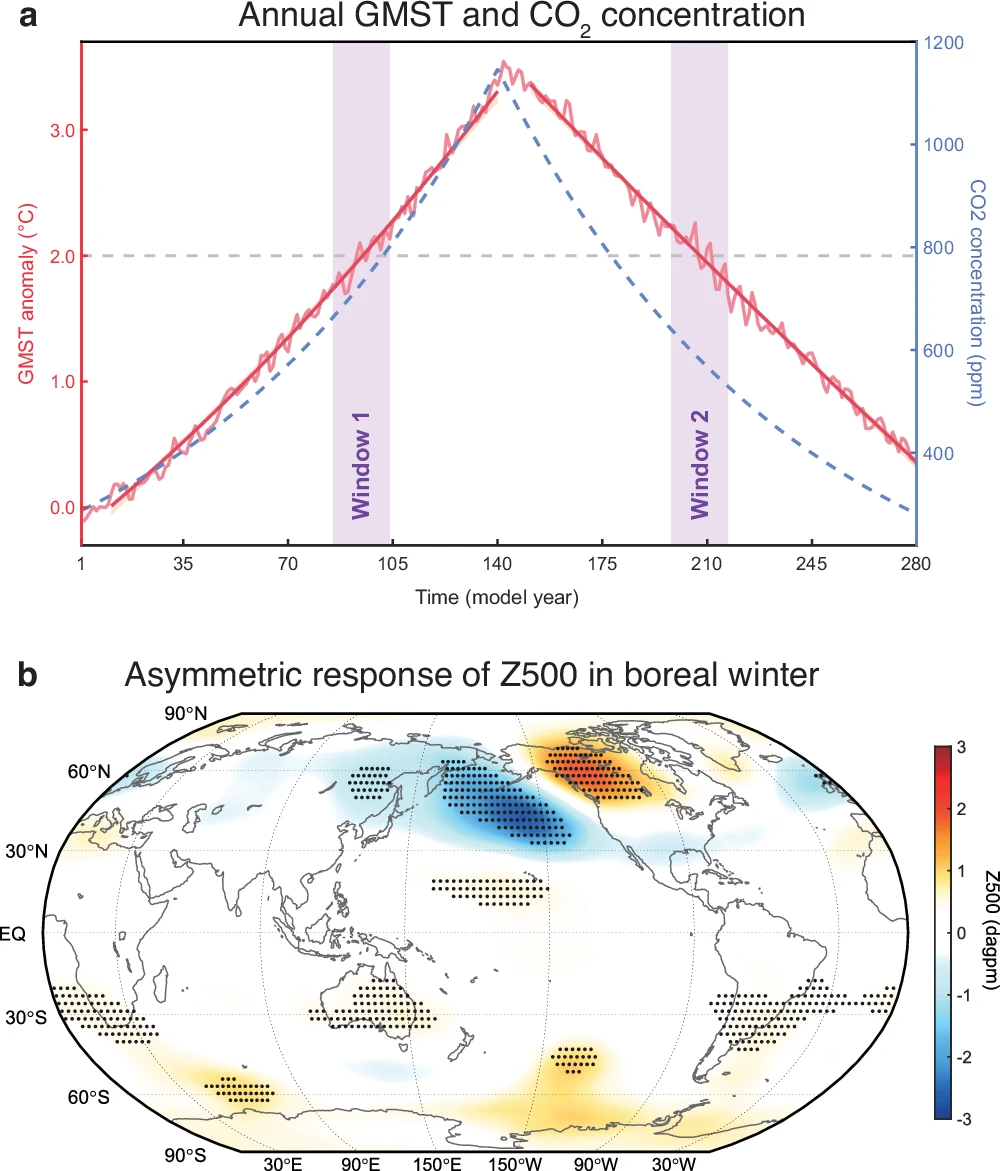 图1.年平均全球地表温度和北半球冬季大气环流的滞后。(a) GMST异常和CO2浓度的时间演变。(b) 北半球冬季500-hPa位势高度的非对称响应。