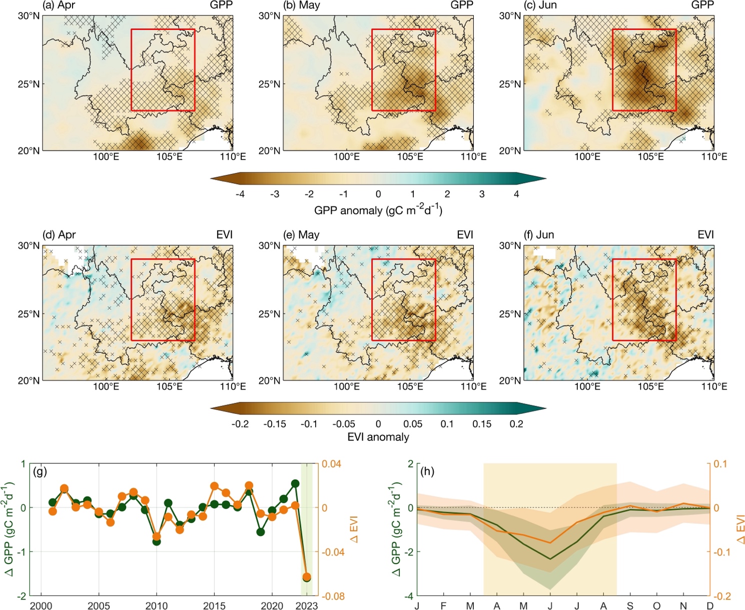 2023年春季,西南地区经历了罕见的极端高温—干旱复合性事件,引发大范围居民用水困难和农作物减产。中国科学院大气物理研究所博士研究生王志凯、朴金玲副研究员、陈尚锋研究员联合云南大学陈文教授、蔡晴宇博士、马天娇副教授和贵州大学薛旭副教授,深入分析了此次极端事件对生态系统的影响,发现其导致当地植被总初级生产力(GPP)和增强型植被指数(EVI)发生近二十年来最为严重的下降。