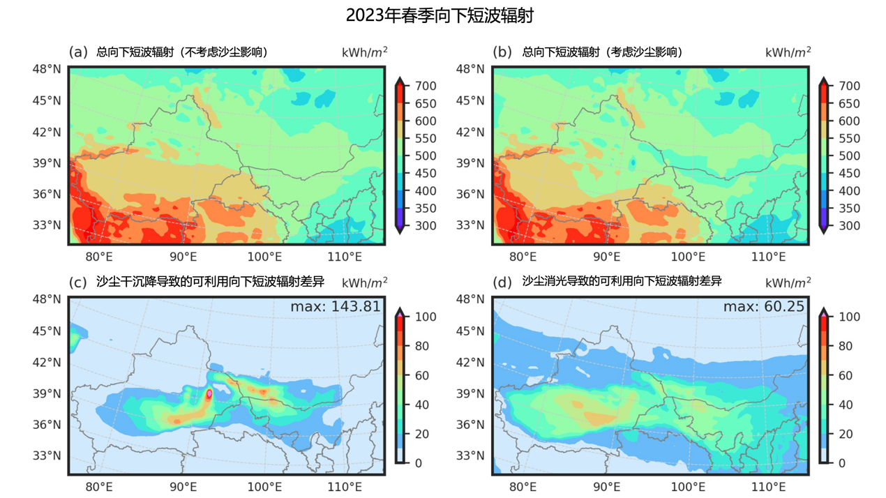 图1 2023年春季中国西北地区可利用向下短波辐射。(a)未考虑沙尘影响和(b)考虑沙尘影响的可利用向下短波辐射;(c)沙尘干沉降和(d)沙尘消光导致的不可利用的向下短波辐射。