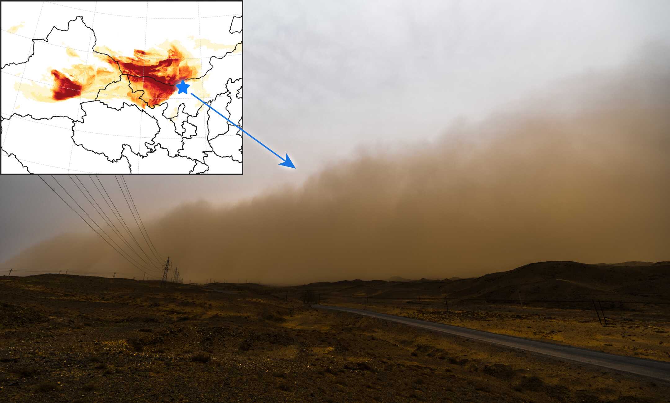 图 2 2024年4月13日,在iDust预报的指导下,陈曦团队与风暴摄影师刘屹靖团队合作在巴彦淖尔地区成功拍摄到一次极端沙尘过程