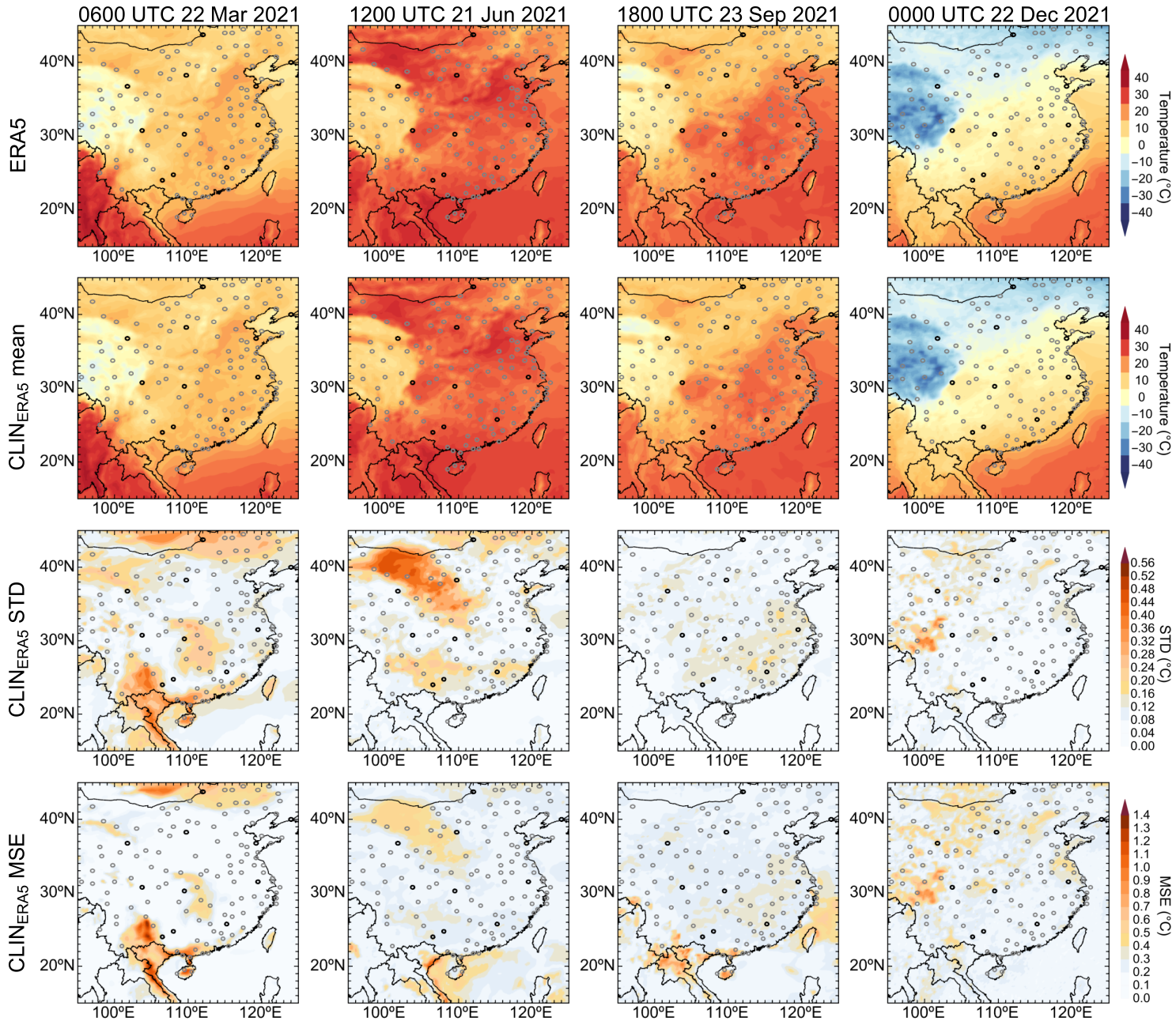研究使用120个气象站数据,基于CLINERA5模型基于120个气象站数据生成100个集合成员,集合平均与ERA5基准高度接近,空间相关系数达0.980 ± 0.02,精确捕捉纬度梯度、地形效应和海陆差异。集合标准差显示,即使有观测约束,某些区域与ERA5的差异仍较大。集合之间的均方误差表明,CLIN生成集合时,部分区域具有较高的不确定性,观测数据难以完全约束整个场。标准差与均方误差的空间形态基本吻合,显示CLIN模型准确捕捉了不确定性分布,验证了模型不确定性量化的可靠性。