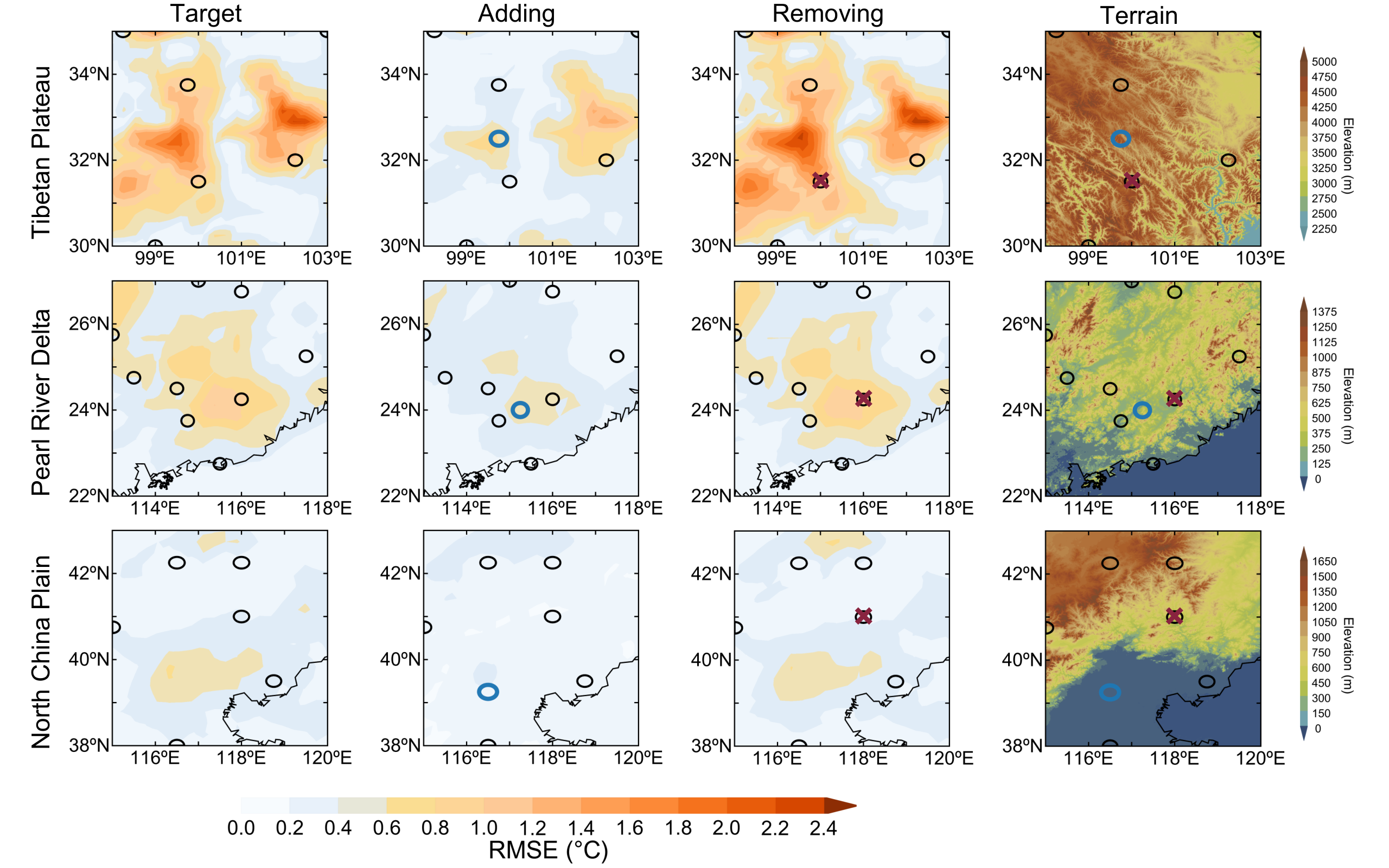图3. CLIN模型增删观测站结果对比。第一列:原始观测误差结果;第二列:增加一个观测站后误差结果;第三列:删除一个观测站后误差结果;第四列:区域所在地形。