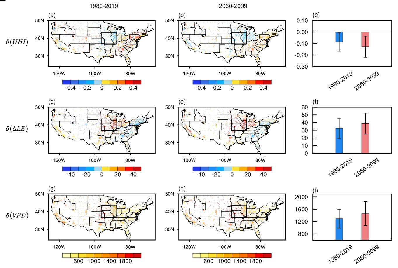 图1. 历史和未来RCP8.5情景下热浪与非热浪时段城市热岛效应的差异及其关键驱动因子。(a-c)城市热岛效应的变化,(d-f)城乡蒸散发差异的变化,(g-i)饱和水汽压差的变化