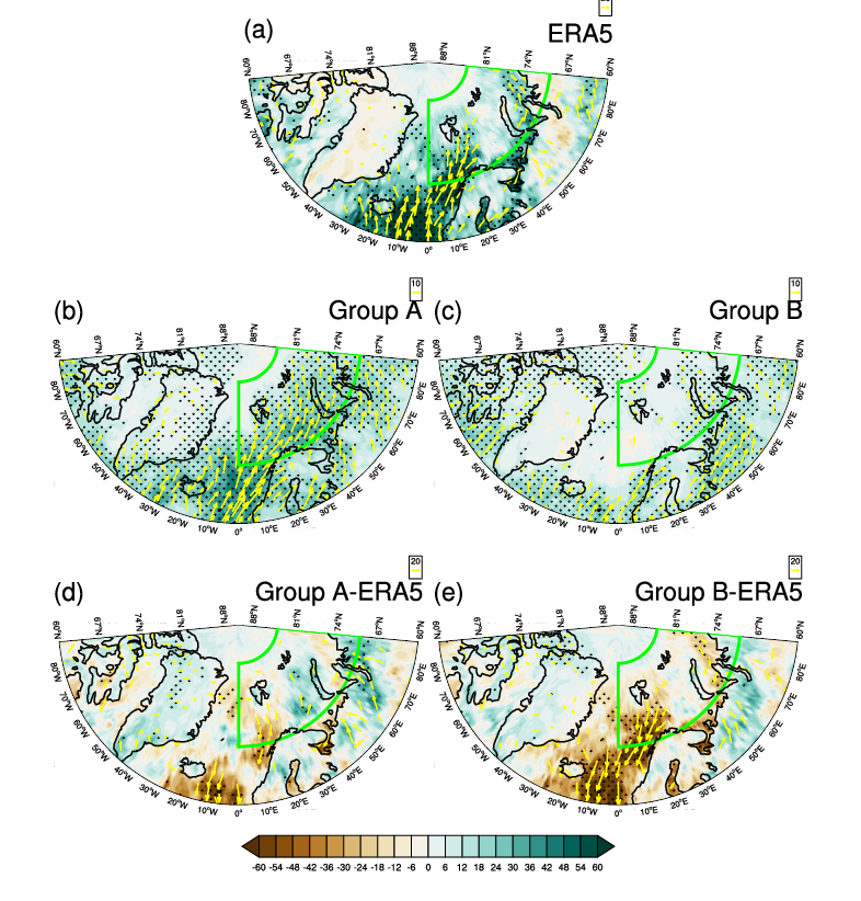 在全球变暖背景下,复合热浪的发生频率在全球范围内显著上升,带来了严峻的环境和社会经济风险。北极巴伦支-喀拉海(BKS)地区的复合热浪事件亦呈快速增长趋势,进一步加剧了海冰融化、永久冻土退化及生态系统破坏等问题。本研究评估了24个CMIP6气候模式在模拟BKS地区秋季复合热浪趋势方面的表现,结果显示,各模式在趋势幅度及空间分布的模拟上存在显著差异。基于对复合热浪变化趋势模拟能力的评估,选取了两组代表性模式:一组能较好再现观测趋势(A组),另一组表现较差(B组),以探讨两组模式模拟差异的成因(图1)。