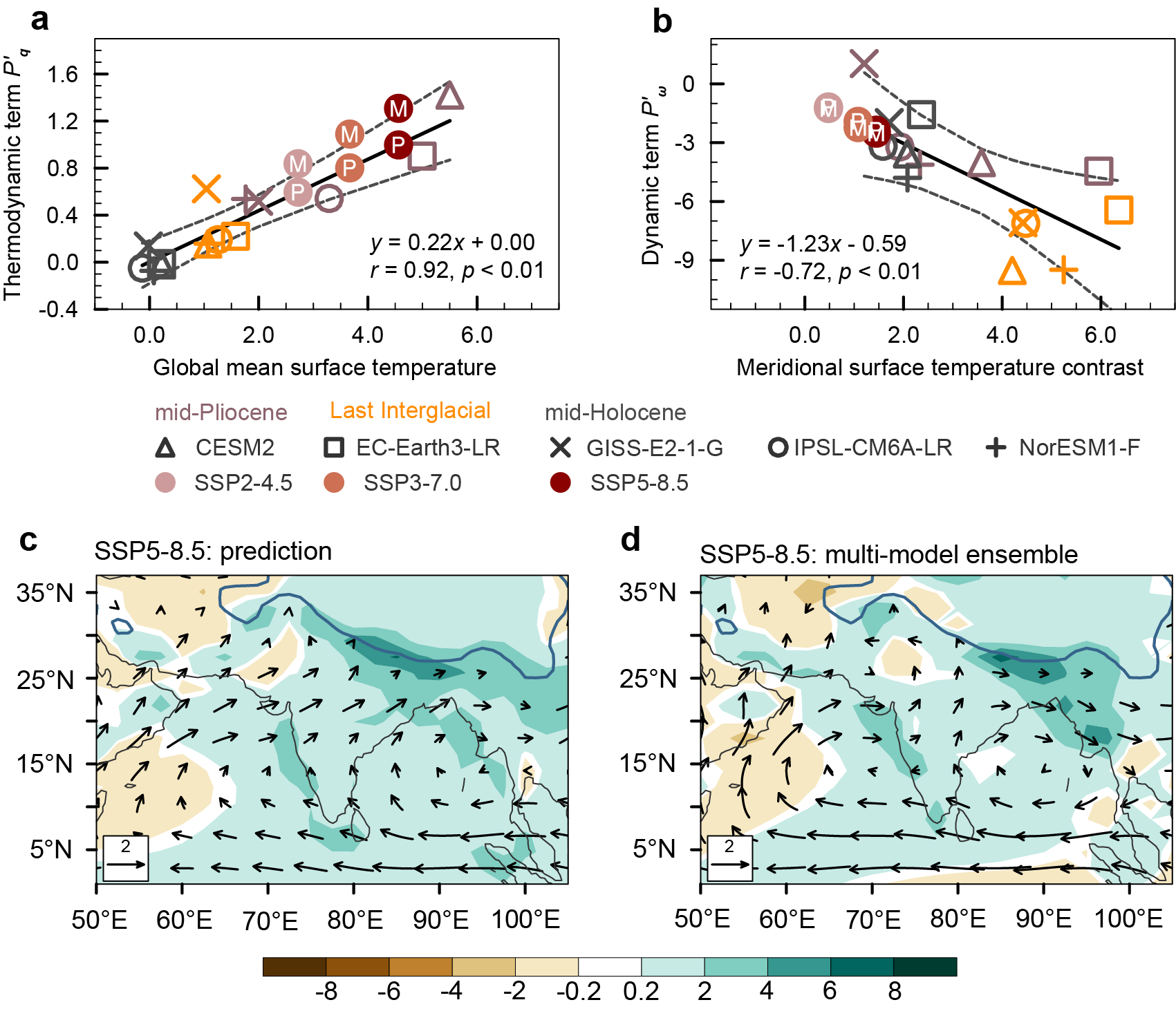 图1.基于过去暖期预测未来南亚夏季风的变化。利用中上新世、末次间冰期和中全新世的全球平均增暖水平、区域经向增暖差异,分别构建南亚夏季风降水热力项和动力项的线性回归模型。根据未来不同情景的增暖特征,利用回归模型预测:(a)季风降水热力项(单位:mm d-1),(b)季风降水动力项(单位:mm d-1),(c)SSP5-8.5情景下季风降水变化(即动力项与热力项之和;填色,单位:mm d-1)和850hPa季风环流变化(箭头,单位:m s-1)。(d)同(c),但为多模式集合平均预估结果。