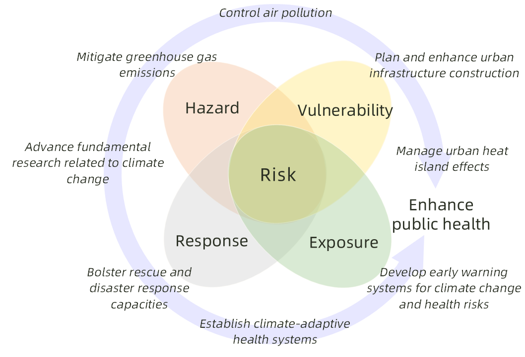 图二、复合极端事件应对方案的概念示意图(基于IPCC气候风险定义:风险源于灾害、脆弱性和暴露的相互作用,并通过响应机制调节)。图中四个重叠椭圆代表核心风险要素,其交集定义为总体风险。外围环绕的是综合策略,旨在保障和提升复合极端事件下的公共健康。