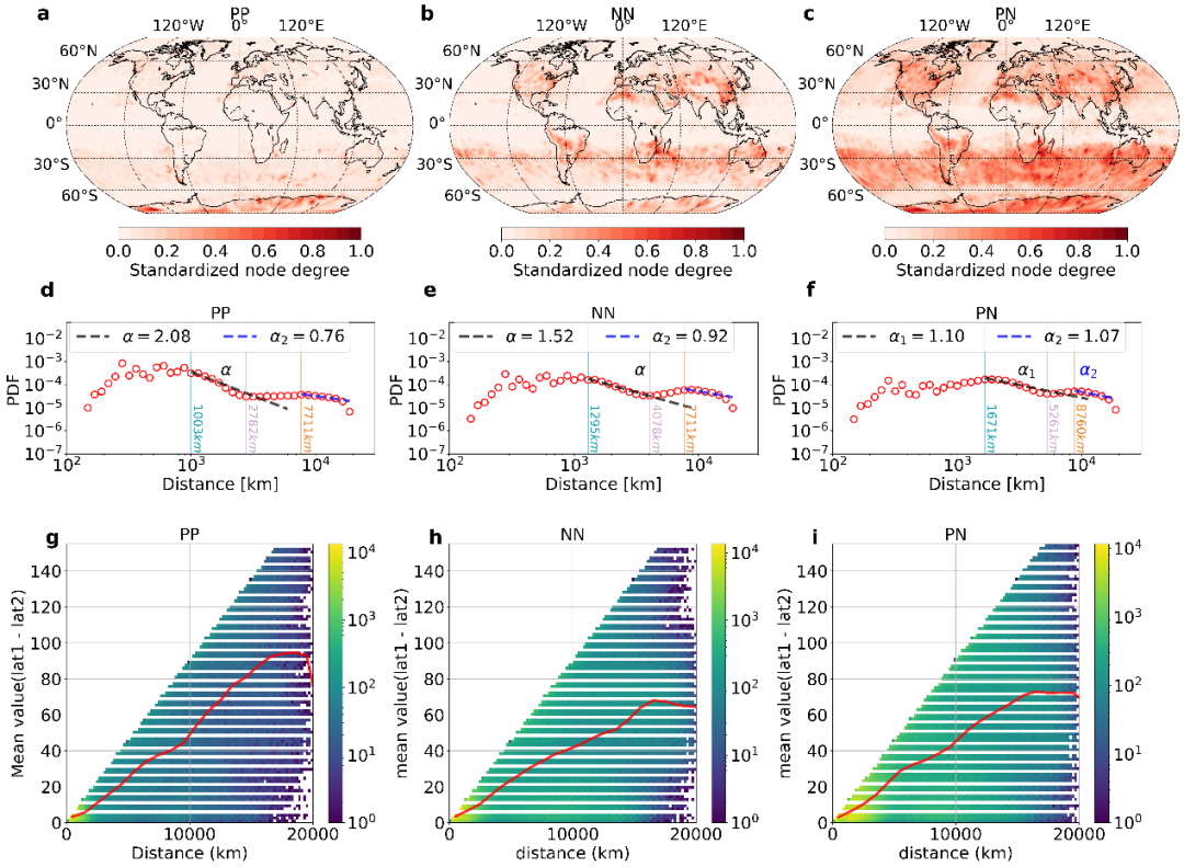 图1:基于极端事件同步的气候网络特征:(a)–(c) 节点度的空间分布,(d)–(f) 链接距离的概率密度函数(PDF),(g)–(i) 同步节点对的纬度差分析