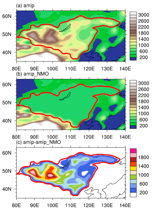 图1. 各试验的地形高度(单位:m)。(a)对照组试验(amip);(b)移除 MP 的试验(amip_NMO);(c)amip 试验与 amip_NMO 试验的差值(粗红线为地形被移除的区域)。