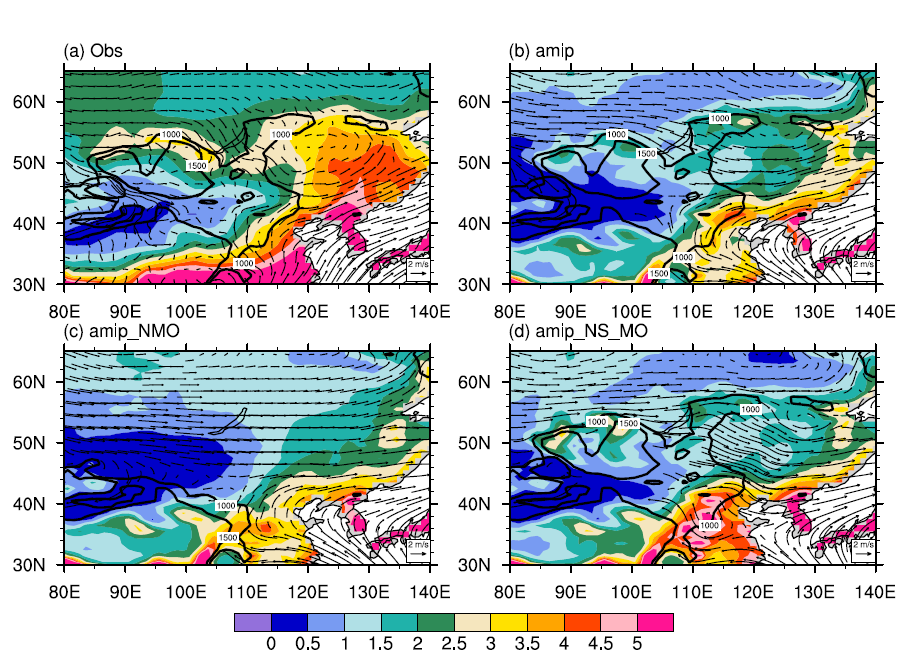 图4. 夏季气候平均降水量(阴影部分;单位:mm/day)及850 hPa风场(箭头;单位:m/s)。(a)GPCP,ERA5;(b)amip;(c)amip_NMO;(d)amip_NS_MO(黑色等值线表示地形高度(单位:m))。