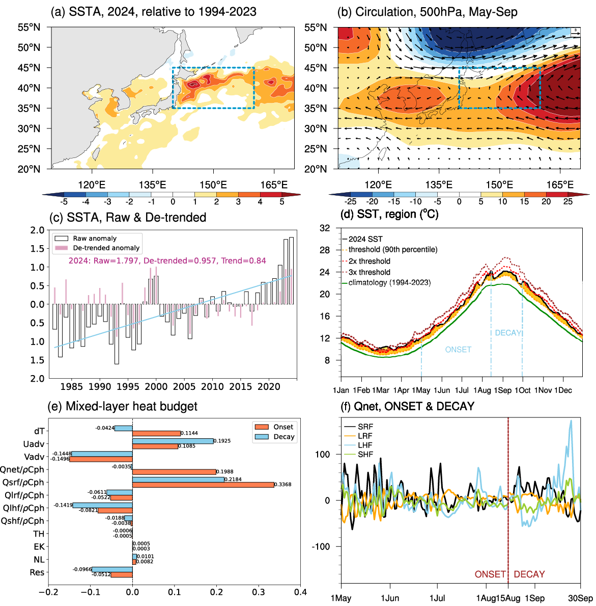 图一、(a) 2024年暖季海表温度异常(℃,阴影图)。蓝色框(35°–45°N,140°–160°E)表示黑潮延伸体区域。(b) 2024年暖季500 hPa位势高度异常(gpm,阴影图)和风场异常(m/s,矢量图)。(c) 1982至2024年暖季期间,黑潮延伸体区域平均海表温度异常(黑色条形图)、线性趋势(蓝色线)和去趋势后的异常值(粉色条形图)时间序列。(d) 2024年逐日海表温度变化(黑色),气候平均海表温度(绿色)和5天滑动平均的90百分位阈值(橙色虚线),用于定义I类(中等)海洋热浪。红色和棕色虚线分别表示II类(强)和III类(严重)海洋热浪的阈值。(e) 2024年黑潮延伸体区域海洋热浪发展(橙色)和衰减(蓝色)阶段的混合层热量收支条形图,包括温度变化(dT)、纬向和经向平流(Uadv, Vadv)、净热通量(Qnet)、短波辐射(Qsrf)、长波辐射(Qlrf)、潜热通量(Qlhf)、感热通量(Qshf)等。(f) 2024年暖季表面热通量异常日变化:短波辐射(Qsrf,黑色)、长波辐射(Qlrf,橙色)、潜热通量(Qlhf,蓝色)和感热通量(Qshf,绿色)。