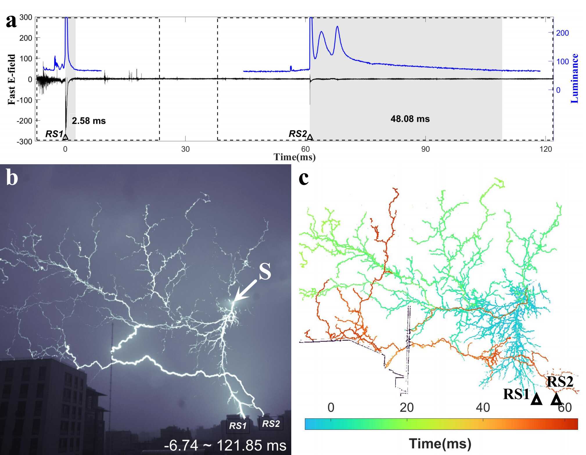 图1. (a) 高速图像记录到的通道发光强度变化(蓝色曲线)、伴随的快速电场变化(黑色曲线)以及持续电流时长(灰色区域)。(b) 合成图像显示相机视场内的所有闪电通道。(c) 展示闪电负先导通道的发展。S点表示闪电出云位置。