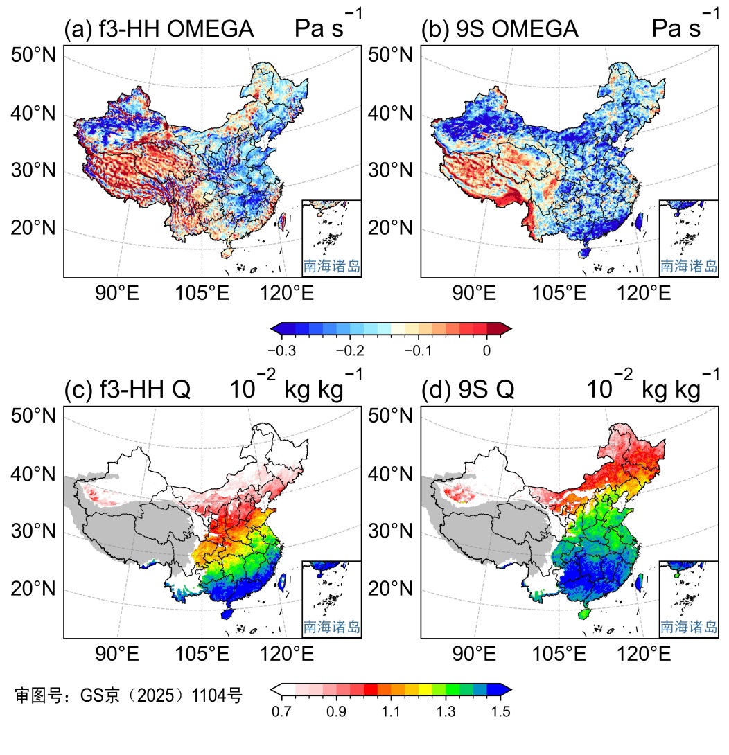 图3 极端降水事件合成的500 hPa垂直速度(Pa s−1)以及850 hPa比湿(kg kg−1)的模拟结果。(a) FGOALS-f3-HH模拟的垂直速度; (b) NICAM16-9S模拟的垂直速度; (c) FGOALS-f3-HH模拟的比湿; (d) NICAM16-9S模拟的比湿。