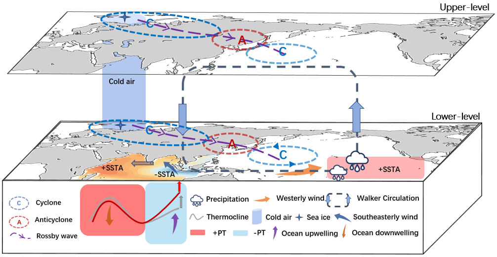 中国科学院大气物理研究所地球系统数值模拟与应用全国重点实验室陈尚锋研究员团队,联合云南大学、浙江大学和复旦大学相关学者,在气候研究领域国际知名期刊《Journal of Climate》上发表题为"Influence of winter Arctic sea ice anomalies on the following autumn Indian Ocean Dipole development"的研究成果。该研究利用观测数据分析、动力机制诊断和多种数值模式试验,揭示了冬季巴伦支海和格陵兰海海冰异常对次年秋季IOD事件发展的显著影响及其关键物理机制。研究发现,当冬季巴伦支海-格陵兰海海冰偏多(偏少)时,次年秋季易出现正(负)IOD事件。巴伦支海-格陵兰海海冰增多会抑制湍流热通量的向上输送,导致对流层冷却,进而激发了从巴伦支海传至副热带北太平洋的大气罗斯贝波列(图1)。线性斜压模式和大气环流模式均可以再现冬季北极海冰异常激发的大气罗斯贝波列。北极海冰增多引发的北太平洋副热带异常气旋,进一步导致副热带北太平洋海表面温度升高,通过"风-蒸发-海温"反馈机制暖海温异常维持并沿着信风方向传至赤道中太平洋。赤道中太平洋暖海温异常进而激发了异常的热带沃克环流,导致热带东南印度洋出现下沉气流及低层东南风异常,最终通过热带印度洋的海气相互作用机制和海洋动力过程,影响秋季IOD事件的发生与发展(图1)。利用CMIP6多模式试验,研究还发现CMIP6多模式集合平均能够较好再现冬季巴伦支海-格陵兰海海冰异常对秋季IOD事件的影响及其物理过程。