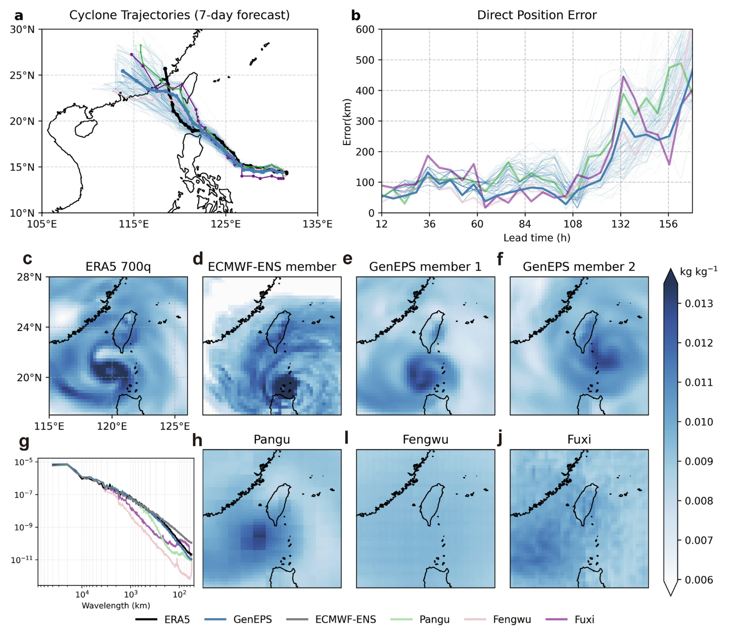 图2:台风"杜苏芮"7天预报(2023年7月21日00UTC初始)。 (c-f)700 hPa比湿场,包括ERA5验证、ECMWF-ENS成员和GenEPS成员;(g)功率谱分析;(h-j)Pangu、Fengwu和Fuxi的确定性预报场。