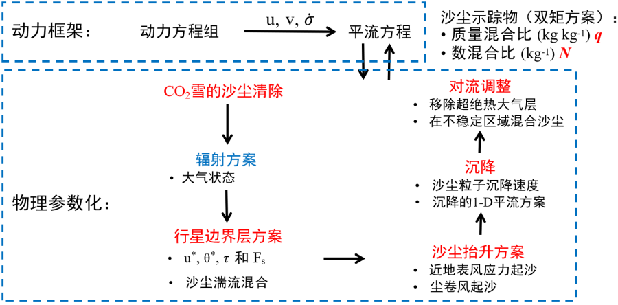 本研究基于GoMars,通过进一步在边界层中引入沙尘湍流混合过程,并结合对地表起沙通量的合理约束,完成了长达50个火星年(1个火星年约等于2个地球年)的沙尘循环模拟,系统探究了其多时间尺度变率特征。GoMars完整描述了沙尘在大气中的运动过程,包括尘卷风和风应力沙尘抬升、沙尘的平流和沉降等。