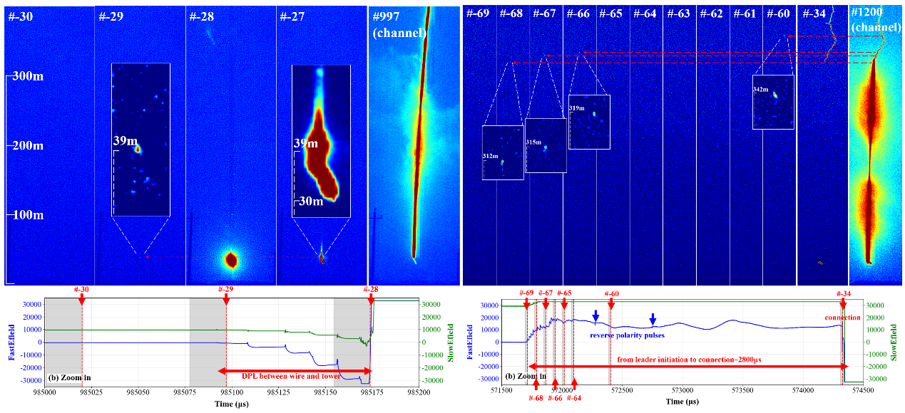 闪电先导作为构建闪电放电通道的基础过程,不仅是认识闪电起始与传输机制及其物理化学效应的关键环节,也是实现人工影响与干预闪电活动的重要前提。双向先导是最基本的闪电先导行为模式,表现为正、负极性先导通道在强电场作用下同时朝相反方向延伸。然而,受观测手段的限制,以往研究大多只能对单一极性的先导过程开展观测,对于双向先导系统中正、负先导行为特征与驱动机制的认识一直比较模糊。