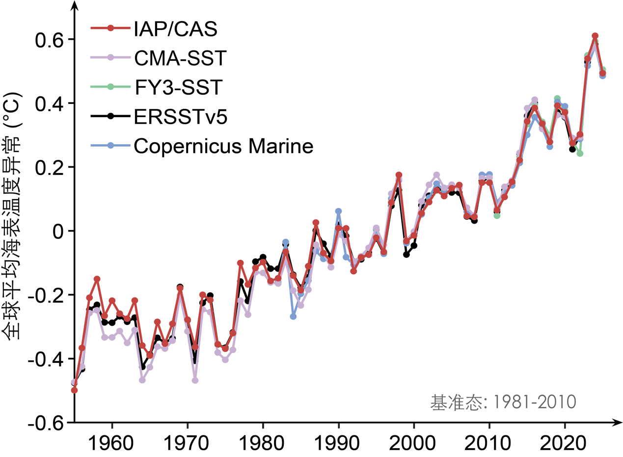2025年,全球平均海表温度(SST)相较2024年略有回落,但仍位居历史第三的高位,这一变化主要受到拉尼娜事件的影响,海洋热量从近表层向次表层输送,导致海洋近表层偏冷而次表层偏暖。国内外数据集均显示:2025年SST较1981-2010年平均态升高了~0.5°C,较2024年降低了~0.1°C。此次SST评估使用了多套中国自主发展的观测数据产品,包括中国科学院大气物理研究所的1米水深温度数据(IAP/CAS)、中国气象局国家气象信息中心的SST重构数据(CMA-SST)、国家卫星气象中心基于风云三号(FY-3)卫星反演的SST 数据(FY3-SST)。