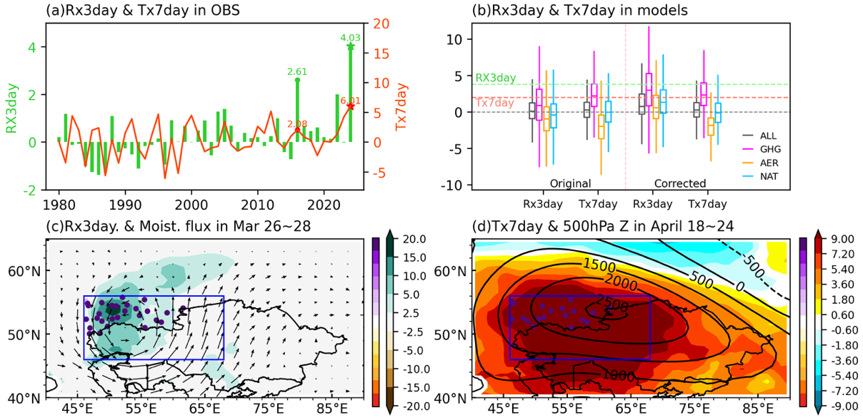 图一、(a)1980–2024年中亚西北部地区(46–68°E,46–56°N)三日极端降水指数(Rx3day,单位:毫米/天)和七日极端高温指数(Tx7day,单位:摄氏度)观测时间序列。(b)CMIP6模式(全强迫、温室气体强迫、自然强迫和气溶胶强迫)原始与偏差校订后的归一化Rx3day和Tx7day四分位箱线图,误差线表示集合成员的5%–95%范围,虚线为2024年观测阈值(绿色:Rx3day,粉色:Tx7day)。(c)2024年3月26–28日Rx3day异常(填色)及850 hPa水汽通量异常(矢量)。(d)2024年4月18–24日Tx7day异常(填色)及500 hPa位势高度异常(等值线),均相对于1980–2010年气候态。点(填色)为GHCN站点观测值,蓝色方框标出受2024年春季洪水影响的中亚西北部区域。