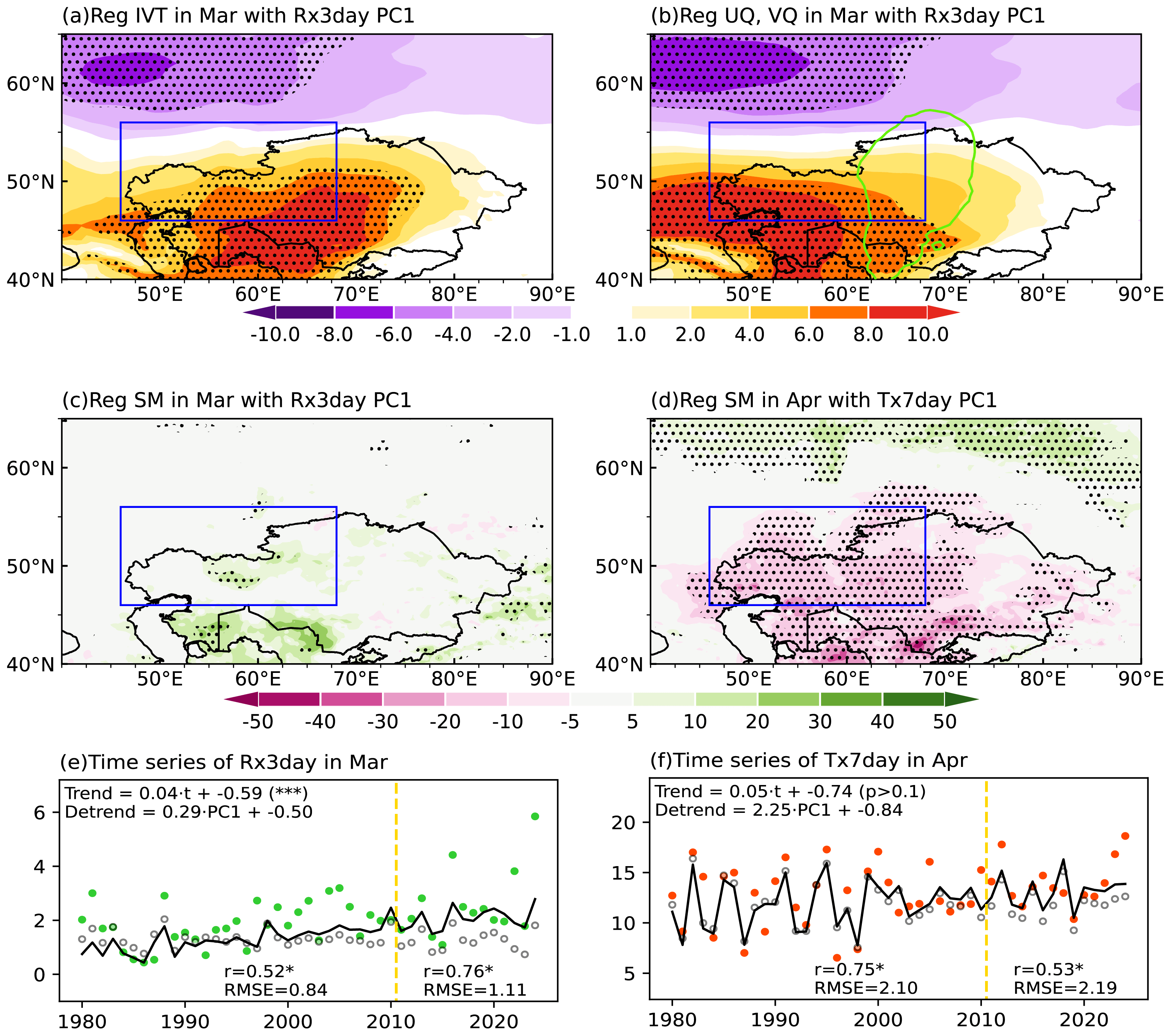 图三、2024年3月三日极端降水指数(Rx3day)与(a)垂直积分水汽通量、(b)经向(填色)和纬向(等值线)水汽输送、(c)土壤含水量的回归。(d)为4月七日极端高温指数(Tx7day)与对应的土壤含水量的回归。(e)、(f)分别为极端降水与极端高温的观测值、重建值及其趋势时间序列。黄色虚线表示2011年。星号表示通过90%置信水平显著性检验。
